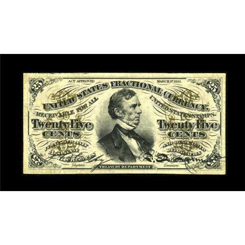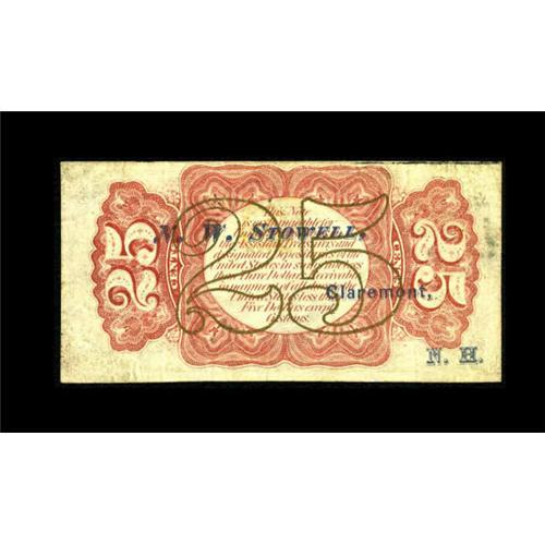 <B>Fr. 1292 25¢ Third Issue Very Fine-Extremely Fine.</B></I> A most unusual Fractional as the back has been overprinted boldly in blue on three lines "M. W. Stowell--Claremont--NH". Apparently Mr. Stowell adopted the old advertising technique of counterstamping coins for advertising and "Counterstamped" this red back Fessenden. It's the first that we have seen of its type. <BR><BR><b>Shipping:</b> Coins & Currency (<a target="_blank" href="http://www.heritageauctions.com/common/shipping.php">view shipping information</a>)