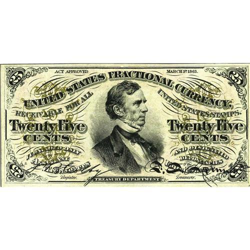 <B>Fr. 1292 25c Third Issue Very Choice New.</B></I> This embossed note is so close to Gem. The back is shifted slightly upwards.