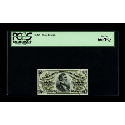 <B>Fr. 1294 25¢ Third Issue PCGS Gem New 66PPQ.</B></I> A spectacular Green Back Fessenden with huge margins, deep embossing, and 100% full color of the paper, ink, and bronze. We remember this note from the last time we sold it as Lot 246 of CAA's May 1996 sale and have seen few its equal over the decade.<BR><BR><b>Shipping:</b> Coin/Currency (<a target="_blank" href="http://www.heritageauctions.com/common/shipping.php">view shipping information</a>)