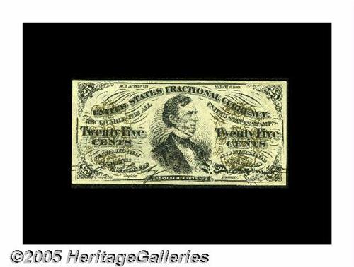 <B>Fr. 1294 Milton 3R25.2a 25¢ Third Issue Very Choice New.</B></I> This Green Back Fessenden is Superb in every sense but for its margins. The back design is low, and the face is tight at the top. The original embossing is pronounced.