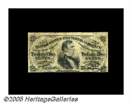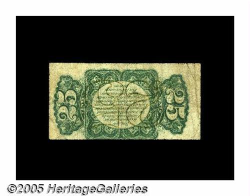 <B>Fr. 1294 Milton 3R25.2h 25¢ Third Issue Entire Back Inverted Fine.</B></I> Well-circulated but a totally solid example of this rare invert. It's one of only two pieces that we are aware of. When last on the market in January 1997 it realized $605. That should prove to have been a bargain.