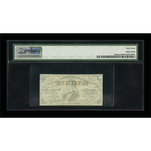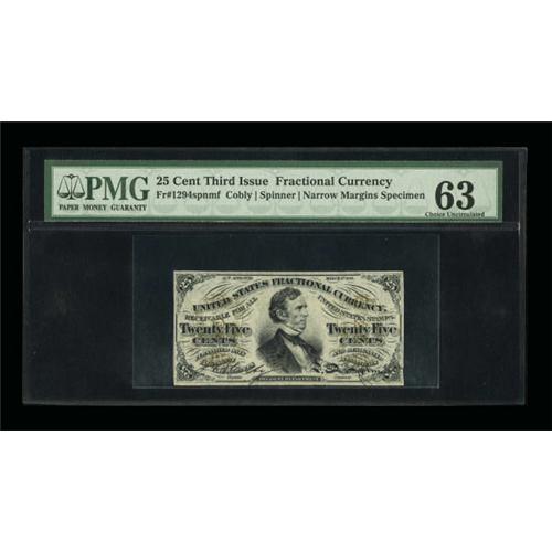 <B>Fr. 1294sp 25c Third Issue PMG Choice Uncirculated 63.</B></I> The bronzing on the face of this narrow specimen is strong and the margins adequate for the grade. The typically inverted "SPECIMEN" can be seen across the back. <BR><BR><b>Shipping:</b> Coins & Currency (<a target="_blank" href="http://www.heritageauctions.com/common/shipping.php">view shipping information</a>)