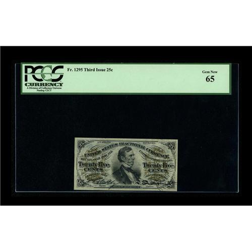 <B>Fr. 1295 25¢ Third Issue PCGS Gem New 65.</B></I> Broadly margined with bright bronze and a handsome overall appearance.<BR><BR><b>Shipping:</b> Coin/Currency (<a target="_blank" href="http://www.heritageauctions.com/common/shipping.php">view shipping information</a>)