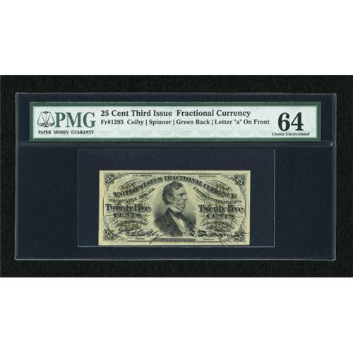 <B>Fr. 1295 25c Third Issue PMG Choice Uncirculated 64.</B></I> A very broadly margined and well embossed example of this scarcer "a" on face Fessenden.<BR><BR><b>Shipping:</b> Coins & Currency (<a target="_blank" href="http://www.heritageauctions.com/common/shipping.php">view shipping information</a>)