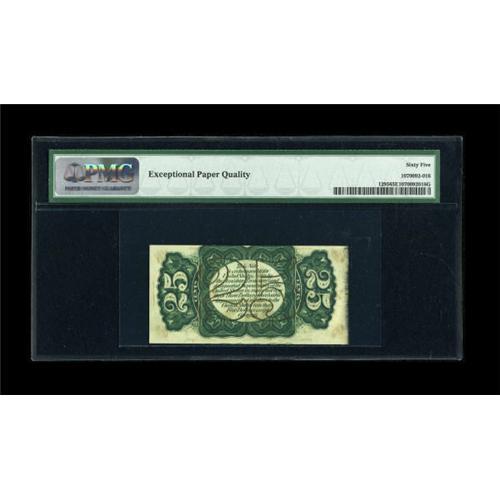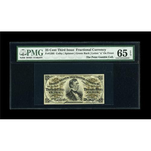 <B>Fr. 1295 25c Third Issue PMG Gem Uncirculated 65 EPQ.</B></I> This Green Back letter "a" issue boasts especially bright paper for the issue. The golden overprint is applied perfectly and remains untoned.<BR><I>From The Peter Gamble Collection.</B></I><BR><BR><b>Shipping:</b> Coins & Currency (<a target="_blank" href="http://www.heritageauctions.com/common/shipping.php">view shipping information</a>)