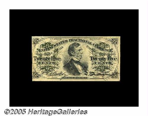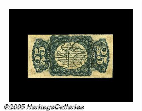 <B>Fr. 1295 Milton 3R25.2v 25¢ Third Issue Inverted Back Surcharge Choice New.</B></I> This piece made its first appearence in our 1995 Memphis Auction where it was acquired by Milt Friedberg. We then sold it as part of the Friedberg Collection in January 1997 when it realized $990. It is decently margined on the face and nearly perfectly so on the back. This discovery note which remains unique to our knowledge is on lightly aged paper but it still retains its full deep embossing. The existence of this variety was always expected, as a number of its plate-mates, Friedberg 1294 inverts, proved that these were made. Until the appearence of this piece a decade ago, none were known to have survived.