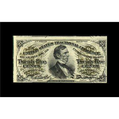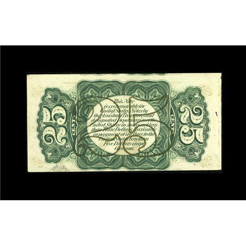 <B>Fr. 1296 25c Third Issue Very Choice New.</B></I> This note was previously part of the Herget Collection. It's an impeccable piece, that would grade Superb but for its centering. The top and left margins are huge, and the bottom and right are very tight, though fully present. The top margin is so large that beyond it a noticeable section of the note above is present, on both the face and back.<BR><I>From The Bill and Kathy Stella Currency Collection</B></I><BR><BR><b>Shipping:</b> Coin/Currency (<a target="_blank" href="http://www.heritageauctions.com/common/shipping.php">view shipping information</a>)