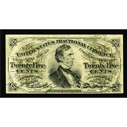 <B>Fr. 1297 25c Third Issue Choice New.</B></I> Terrific grade for a Fiber Paper Fessenden. The note has all the possible technical merits but for its centering. The bottom face is close to the frame line, but not the design, and the back design touches at the bottom. It's strictly original and unusually bright for a Fiber Paper note.