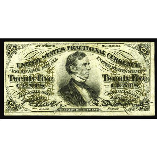<B>Fr. 1297 25c Third Issue Choice New,</B></I> pinholes. A beautiful fiber paper Fessenden that would grade fully Gem if the margins were a bit more even, and if someone had not put a staple through the left side edge of the note. The note has all of its original embossing.