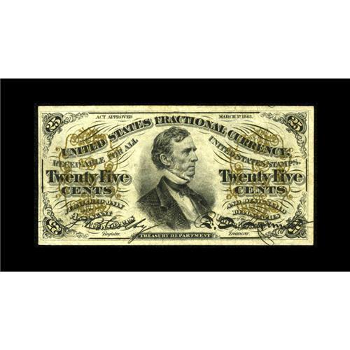 <B>Fr. 1297 25c Third Issue Gem New.</B></I> This is a lovely Fessenden with broad margins, bright bronze, original paper surfaces, and loads of eye appeal. An unusually nice example of this rather difficult to locate Fiber Paper type.<BR><BR><b>Shipping:</b> Coin/Currency (<a target="_blank" href="http://www.heritageauctions.com/common/shipping.php">view shipping information</a>)