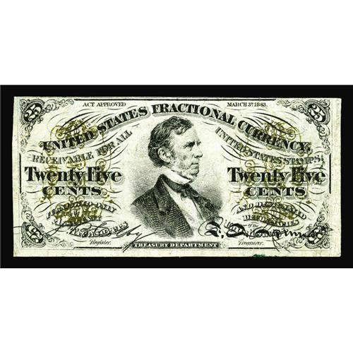 <B>Fr. 1297 25c Third Issue Inverted "M" About New.</B></I> We sold this note once before in our January 2002 Sale, where it was described, "At first glance, this appears to be a perfectly ordinary Fiber Paper Fessenden, but on closer inspection, the M in the M-2-6-5 surcharge is clearly inverted! We've examined this note extremely closely, and are unquestionably convinced that we are not looking at an alteration of any kind. Every year, our FUN sale has a few Fractional items that usurp the interest of the advanced collectors who always attend. We suspect that this year, this note will be the item that garners the most conversation among Fractional experts." At that sale, the note did indeed cause quite a stir and it realized more than $1,600. We expect that figure to be easily surpassed this evening.