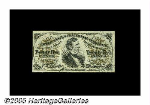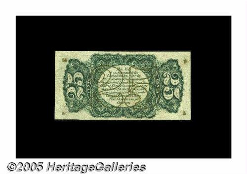 <B>Fr. 1297 Milton 3R25.4 25¢ Third Issue Very Choice New.</B></I> A super-nice example of this Fiber Paper Fessenden that is Superb in every sense save for a slightly tight left face margin. The colors are beautifully bright, the surfaces strictly original, and the back centering absolutely perfect. The heavy fiber paper used on these Fessendens was highly subject to splitting, chipping and aging. This beauty, with its reflectively bright bronze, has escaped all those perils.