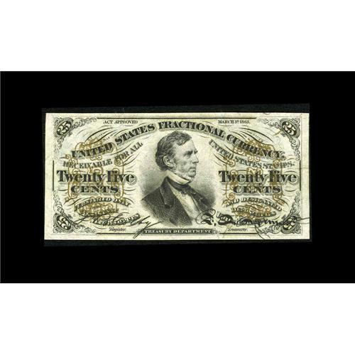 <B>Fr. 1298 25¢ Third Issue Superb Gem New.</B></I> One of the three nicest 1298's that we have ever seen. This piece has huge margins all the way around the face, and the back, though a touch high, is clear of the edge. The bronze is fully bright and reflective, and the note has its original embossing and perfect paper surfaces. Undoubtedly one of the finest, if not the finest 1298 in existence. The Liechty piece, which we sold in January of 1994, was a virtual twin of this note, and it realized over $600 eleven years ago.