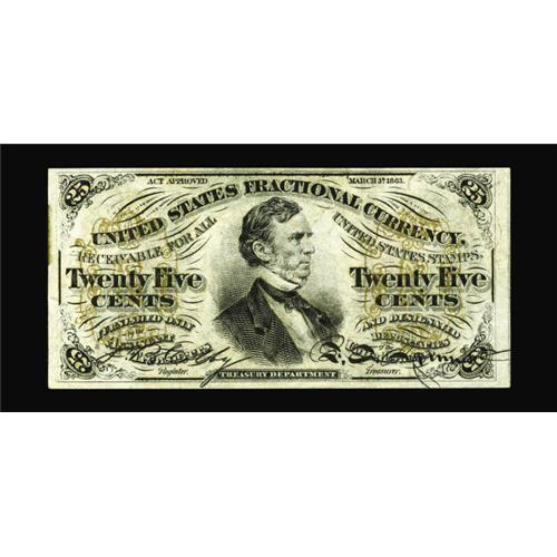 <B>Fr. 1298 25c Third Issue Choice New.</B></I> The bronze on this fiber paper note has taken on a lovely golden hue that adds to its appeal. The back is centered high while the left edge shows a thin strip from a possible adhesive.