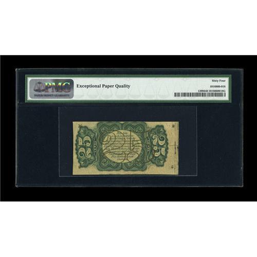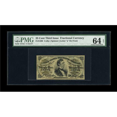 <B>Fr. 1298 25c Third Issue PMG Choice Uncirculated 64 EPQ.</B></I> A beautiful example of this much more difficult "a" on face fiber paper fractional that has been blessed with excellent margins, clear surcharges and blinding bronzing. PMG has stated that this note exhibits "Exceptional Paper Quality." This is a much tougher number than the Fr. 1297 type note and will require a healthy premium bid to obtain it.<BR><BR><b>Shipping:</b> Coins & Currency (<a target="_blank" href="http://www.heritageauctions.com/common/shipping.php">view shipping information</a>)