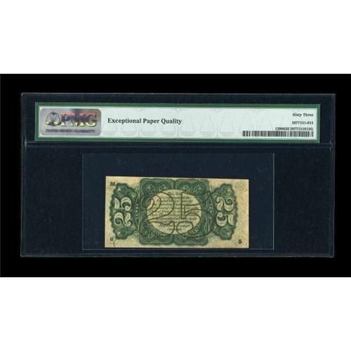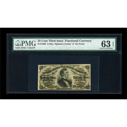 <B>Fr. 1298 25c Third Issue PMG Choice Uncirculated 63 EPQ.</B></I> This is an interesting as made printing variant of this Friedberg number as the "2" surcharge on the back is missing.<BR><BR><b>Shipping:</b> Coins & Currency (<a target="_blank" href="http://www.heritageauctions.com/common/shipping.php">view shipping information</a>)