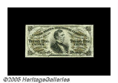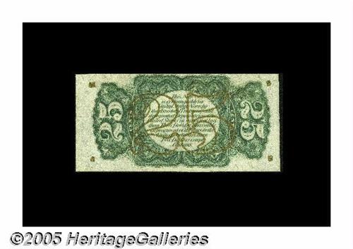 <B>Fr. 1298 Milton 3R25.4a 25¢ Third Issue Superb Gem New.</B></I> One of the three nicest 1298's that we have ever seen. This piece has huge margins all the way around the face, and the back, though a touch high, is clear of the edge. The bronze is fully bright and reflective, and the note has its original embossing and perfect paper surfaces. Undoubtedly one of the finest, if not <I>the</B></I> finest 1298 in existence. The Liechty piece, which we sold in January of 1994, was a virtual twin of this note, and it realized over $600 eleven years ago.