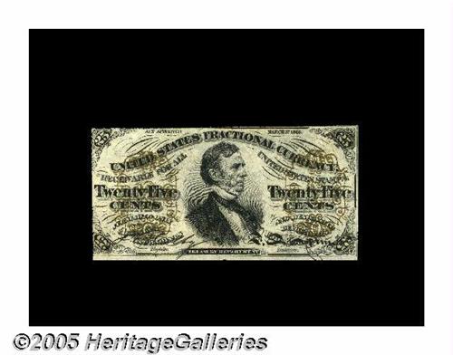 <B>Fr. 1298 Milton 3R25.4b 25¢ Third Issue Inverted Back Engraving Choice New.</B></I> But for the centering, which is quite off on both sides, this extremely rare invert is a pure Gem. The paper and bronze are fully bright, and there is not a hint of any sort of defect. This is the plate note from Milt Friedberg's Fractional Encyclopedia and it is photographed both face and back on page 100. It's the finer of two known examples and it realized $825 when we last auctioned it in 1997.