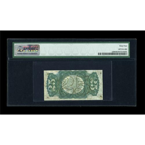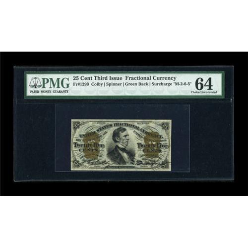 <B>Fr. 1299 25¢ Third Issue PMG Choice Uncirculated 64.</B></I> Fr. 1299 is a rare number in any grade, but attractive damage-free examples of this thin, fiber paper note are truly rare. This one is bright with a nice golden appearance to the solid bronze surcharges. PMG has graded only five Fr. 1299s to date, and this 64 is alone at the top of the census. <BR><BR><b>Shipping:</b> Coins & Currency (<a target="_blank" href="http://www.heritageauctions.com/common/shipping.php">view shipping information</a>)
