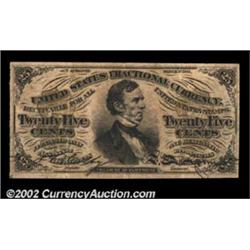 Fr. 1299 25c Third Issue Extremely Fine. This good-looking, solid-surcharge Fessenden has unusually large margins for the type and a perfectly centered face. The back is off-center to the top, but only slightly so. The note is free of the flaws that generally plague Fiber Paper Fessendens, and it has the added plus of face-plate number 6 in its lower left corner. Important notice: We expect to be auctioning lots at the rate of 200-250 per hour. Sometimes eBay Premier live bid software cannot keep up with that pace, so we strongly recommend that you place a realistic proxy bid now as insurance to avoid disappointment. Also please note that all Heritage/CAA lots purchased through eBay Premier carry a 20% Buyer's Premium. Please make sure you read the Terms and Conditions.