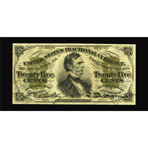 <B>Fr. 1299 25c Third Issue Extremely Fine.</B></I> This good-looking, solid-surcharge Fessenden has unusually large margins for the type and a perfectly centered face. The back is off-center to the top, but only slightly so. The note is free of the flaws that generally plague Fiber Paper Fessendens, and it has the added plus of back-plate number 1 in its lower left corner.