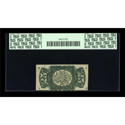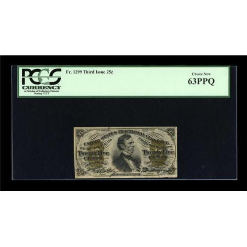 <B>Fr. 1299 25c Third Issue PCGS Choice New 63PPQ.</B></I> This solid-surcharge Fessenden is a rare and perennially popular type. Most examples on this heavy fiber paper are aged, poorly printed or damaged. The paper itself split very easily, and its rough surface was less than ideal for receiving the ink or bronzing. This particular example is a conspicuous exception, with absolutely none of the problems that are normally encountered. It's bright, well printed and beautifully bronzed. It's well centered on the face, and the back is only slightly low, just barely touching the bottom margin. This is the only 63 yet graded by PCGS; PMG has also graded one 63 and a single 64. A beautiful note.<BR><I>From The Thomas M. Flynn Collection</B></I><BR><BR><b>Shipping:</b> Coins & Currency (<a target="_blank" href="http://www.heritageauctions.com/common/shipping.php">view shipping information</a>)
