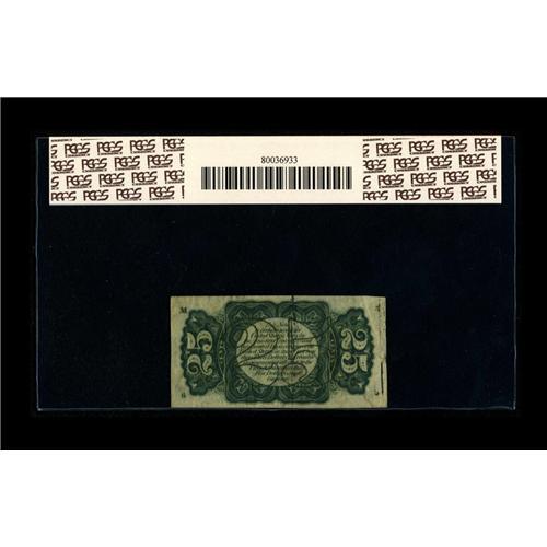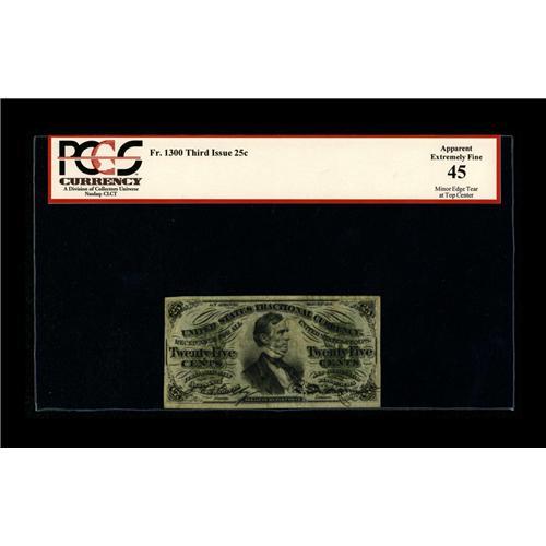 <B>Fr. 1300 25c Third Issue PCGS Extremely Fine 45.</B></I> Red Holdered due to a minor tear at the top center--and it certainly is minor. Very few examples of this truly rare Fractional number are known without major restorations. This one has wholly escaped that and its single flaw is a minute split in the extra-large top margin. Without question in the top ten of the twenty or so examples known for this solid surcharge "a" variety.<BR><BR><b>Shipping:</b> Coin/Currency (<a target="_blank" href="http://www.heritageauctions.com/common/shipping.php">view shipping information</a>)