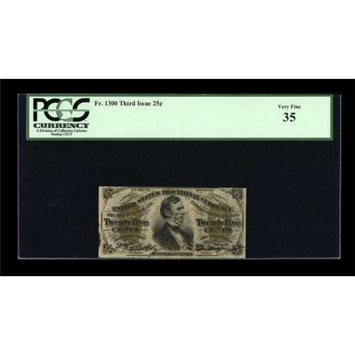 <B>Fr. 1300 25c Third Issue PCGS Very Fine 35.</B></I> Fr. 1300 is one of the classic Fractional Currency rarities. Only a few more than a dozen Fr. 1300's are known to us, and this one is about halfway in the condition census. Few 1300's have escaped damage of some sort, with their very brittle paper, and this one is problem free. The solid bronze surcharges are bright, and the "a" is well printed and clear. A handsome note.<BR><I>From The Thomas M. Flynn Collection</B></I><BR><BR><b>Shipping:</b> Coins & Currency (<a target="_blank" href="http://www.heritageauctions.com/common/shipping.php">view shipping information</a>)