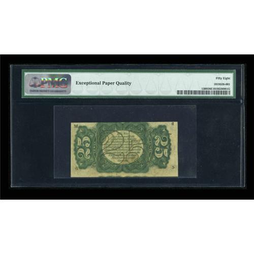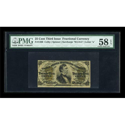 <B>Fr. 1300 25c Third Issue PMG Choice About Unc 58 EPQ.</B></I> This solid surcharge Fessenden with the design letter "a" is one of the classic Fractional currency rarities. This piece has avoided the damage common to these very brittle fiber paper notes. PMG has graded seven Fr. 1300's, and this is the only one in any grade that has been granted the "Exceptional Paper Quality" comment.<BR><BR><b>Shipping:</b> Coins & Currency (<a target="_blank" href="http://www.heritageauctions.com/common/shipping.php">view shipping information</a>)