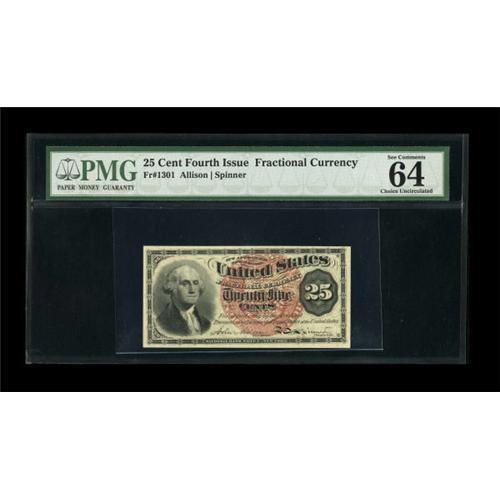 <B>Fr. 1301 25¢ Fourth Issue PMG Choice Uncirculated 64 EPQ.</B></I> This Fourth Issue 25¢ is the variety printed on the watermarked paper. It's bright and well margined, and it falls just short of the full Gem grade.<BR><BR><b>Shipping:</b> Coins & Currency (<a target="_blank" href="http://www.heritageauctions.com/common/shipping.php">view shipping information</a>)