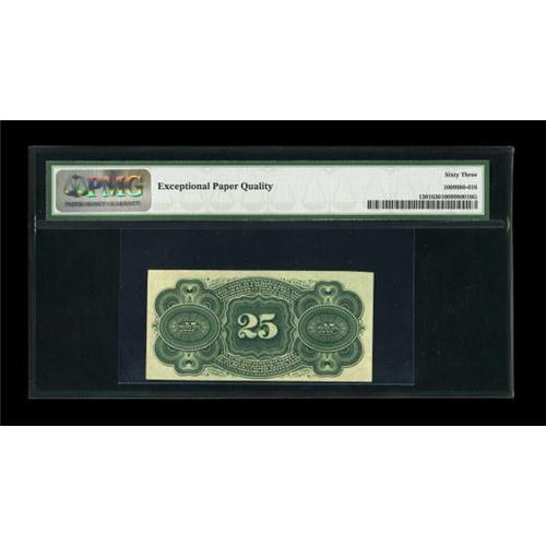 <B>Fr. 1301 25¢ Fourth Issue PMG Choice Uncirculated 63 EPQ.</B></I> Although PMG makes no mention of it on the holder, the seal on this note approaches the tone considered brown by most collectors. Unlike the Large Size notes of this same era, Fractionals were not printed with both red and brown seals. All seals on these Fourth Issue notes were printed in red. Exposure combined with varying properties of sizing chemicals caused some red seals to turn brown over time. Decades ago, these were collected a separate variety. That situation has now been corrected, but many collectors still like to add "Brown Seals" to their holdings. This 1301 comes quite close.<BR><BR><b>Shipping:</b> Coins & Currency (<a target="_blank" href="http://www.heritageauctions.com/common/shipping.php">view shipping information</a>)