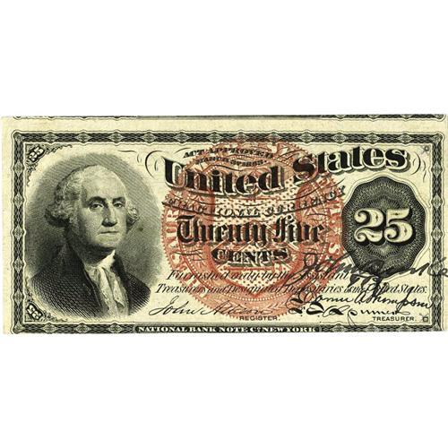 <B>Fr. 1301 25c Fourth Issue Courtesy Autograph New.</B></I> This lovely note bears the double courtesy autograph of John Burke and Carmi Thompson. Double courtesy autographs are quite rare, and this is the only one we know of on a Fourth Issue 25c. The host note is fresh and bright and would grade Gem save for its rather poor centering.