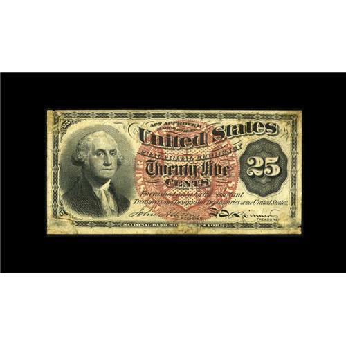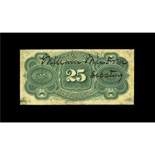 <B>Fr. 1302 25c Fourth Issue Courtesy Autograph New.</B></I> At first glance one might wonder what this note is doing in this sale as it is New but with damage from mounting removal. When one turns the note over the bold autograph of William Windom, Secretary stretches across the upper portion of the note. This cataloger cannot recall having seen a Windom autograph on a fractional and it is likely very scarce.