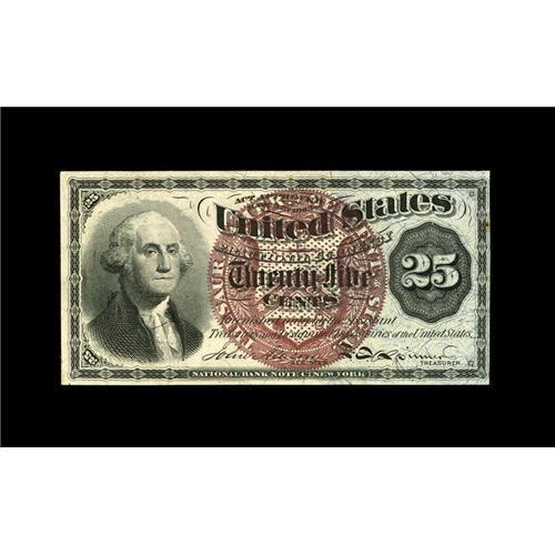 <B>Fr. 1303(5?) 25¢ Fourth Issue Choice New.</B></I> Previously Lot 713 from our January 1997 sale of the Milt Friedberg Collection where it was described, "The brown seal on this Washington is as dark as they ever come. This piece truly has the look of a note whose seal was printed in brown ink. The only things preventing this beauty from grading fully Gem are a tight right margin and a small dot of a rust spot." Milt acquired this interesting piece when he purchased the F.T. Joers collection.<BR><I>From The Bill and Kathy Stella Currency Collection</B></I><BR><BR><b>Shipping:</b> Coin/Currency (<a target="_blank" href="http://www.heritageauctions.com/common/shipping.php">view shipping information</a>)