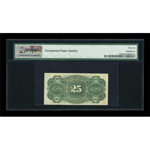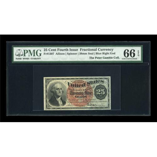 <B>Fr. 1307 25¢ Fourth Issue PMG Gem Uncirculated 66 EPQ.</B></I> Beautiful margins, square corners, and ideal paper surfaces all come together on this note. Fr. 1307 is a common number, but is very difficult to find in this high a grade. PMG has graded only three Fr. 1307s at this level with none higher. <BR><I>From The Peter Gamble Collection.</B></I><BR><BR><b>Shipping:</b> Coins & Currency (<a target="_blank" href="http://www.heritageauctions.com/common/shipping.php">view shipping information</a>)