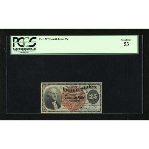 <B>Fr. 1307 25c Fourth Issue PCGS About New 53.</B></I> All four margins are at least 1mm on this lightly circulated note that just misses new.<BR><BR><b>Shipping:</b> Coins & Currency (<a target="_blank" href="http://www.heritageauctions.com/common/shipping.php">view shipping information</a>)