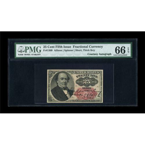 <B>Fr. 1309 25c Fifth Issue Courtesy Autograph PMG Gem Uncirculated 66 EPQ.</B></I> Lee McClung has signed this very well margined and nicely centered note.<BR><BR><b>Shipping:</b> Coins & Currency (<a target="_blank" href="http://www.heritageauctions.com/common/shipping.php">view shipping information</a>)
