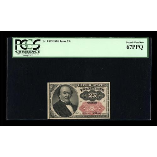 <B>Fr. 1309 25c Fifth Issue PCGS Superb Gem New 67PPQ.</B></I> Wide margins and excellent color are found on this note PCGS graded Superb Gem New 67PPQ example.<BR><BR><b>Shipping:</b> Coins & Currency (<a target="_blank" href="http://www.heritageauctions.com/common/shipping.php">view shipping information</a>)