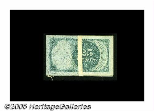 <B>Fr. 1309 5R25.1b 25¢ Fifth Issue Original Pack of 40 Gem New.</B></I> This clearly original pack is made up almost entirely of beautifully centered notes. All the notes are tied together by having been sewn in their lower-right corner. The original knotted thread remains. Consequently, each note has a needle hole. But for that needle hole, the great majority are fully Gem.