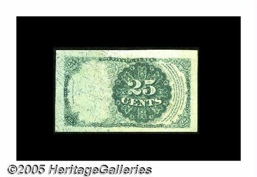 <B>Fr. 1309 Milton 5R25.1 25¢ Fifth Issue Courtesy Autograph Choice About New.</B></I> There are a few pinholes in this Fifth Issue note that is signed extremely lightly by D.N. Morgan vertically at the left end. The signature is so light that it's amazing it was ever spotted.