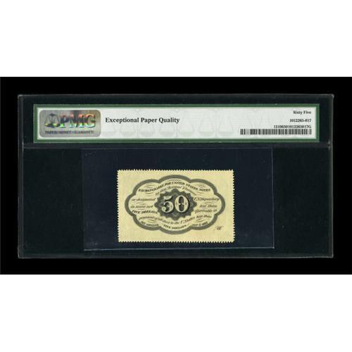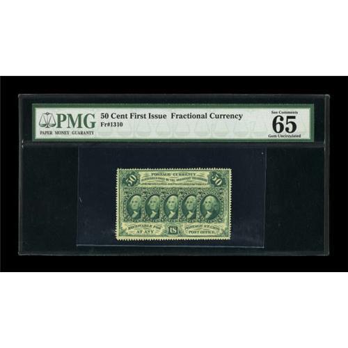 <B>Fr. 1310 50¢ First Issue PMG Gem Uncirculated 65 EPQ.</B></I> Full perforations all the way around highlight this First Issue Fifty Cent. The colors are excellent, and the back is even a bit better centered than the rather nice face.<BR><BR><b>Shipping:</b> Coins & Currency (<a target="_blank" href="http://www.heritageauctions.com/common/shipping.php">view shipping information</a>)