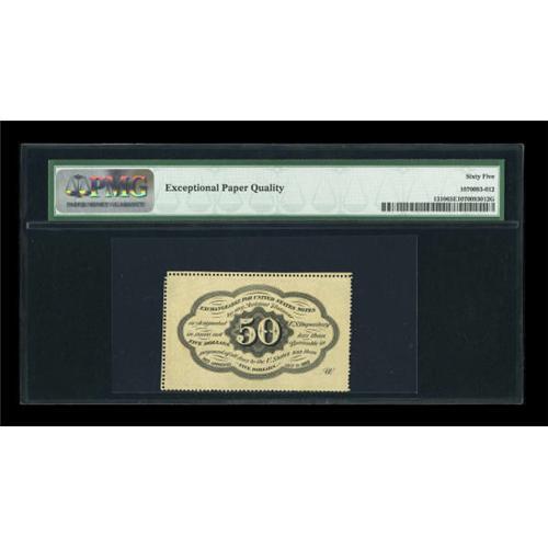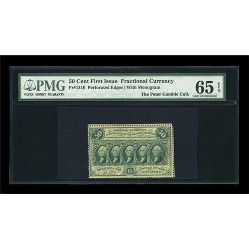 <B>Fr. 1310 50¢ First Issue PMG Gem Uncirculated 65 EPQ.</B></I> A handsome note with deep perforations all the way around. There is an extra strip of margin outside the perforations at the top and right, additionally enhancing the already striking appearance of this early Fractional note. <BR><I>From The Peter Gamble Collection.</B></I><BR><BR><b>Shipping:</b> Coins & Currency (<a target="_blank" href="http://www.heritageauctions.com/common/shipping.php">view shipping information</a>)