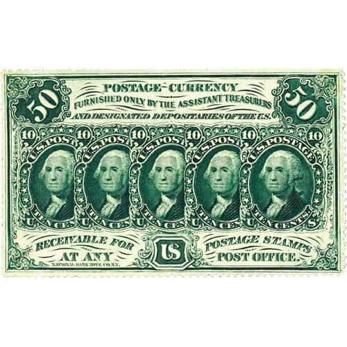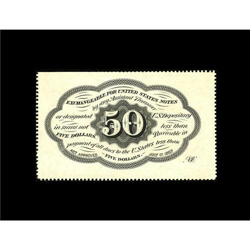 <B>Fr. 1310 50c First Issue Choice New.</B></I> This gorgeous perforated 50 Cent note is a Superb example in every sense save one, the perforations at the top taper off as they move to the right, and the top right margin becomes straight at its far end. The centering of both sides are perfect, and the colors are beautifully bright.