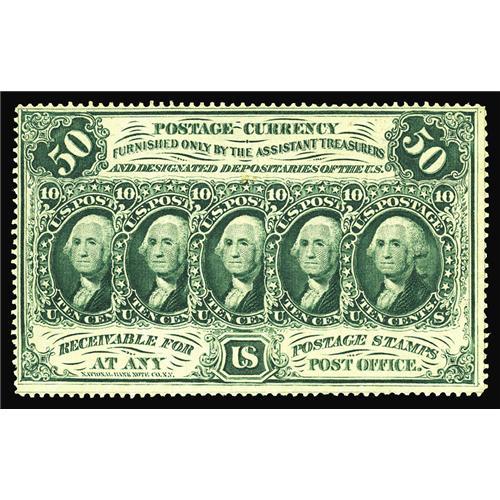<B>Fr. 1310 50c First Issue Gem New.</B></I> Deep, even perforations all the way around, ideal color, fresh paper surfaces and not a hint of so much as a handling mark. The back centering is 100% perfect, and the face, although shy of perfection, is extraordinary for the type. A real beauty.