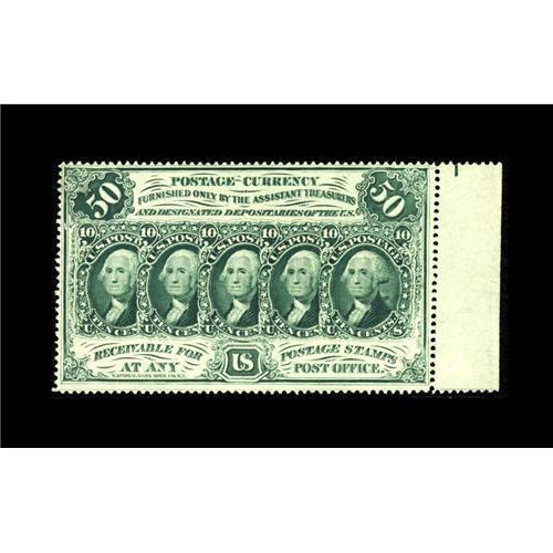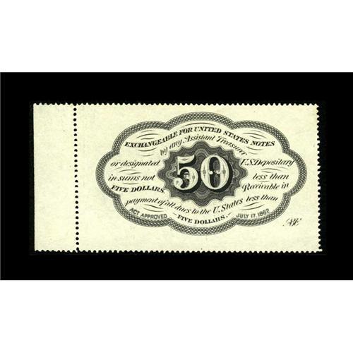 <B>Fr. 1310 50c First Issue Gem New.</B></I> This is an absolutely magnificent example of this scarce and popular Fifty Cent Perforated Edge Type. It has deep, even perforations all the way around and a half-inch-wide selvage strip at the right, outside of the perforations. The back centering is ideal, the paper surfaces strictly original, and the overall quality is essentially without peer.<BR><BR><b>Shipping:</b> Coin/Currency (<a target="_blank" href="http://www.heritageauctions.com/common/shipping.php">view shipping information</a>)