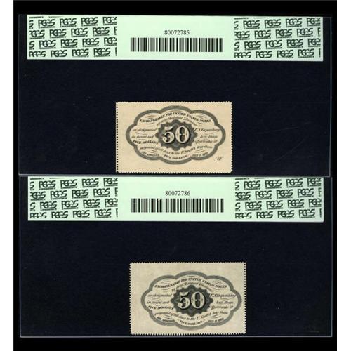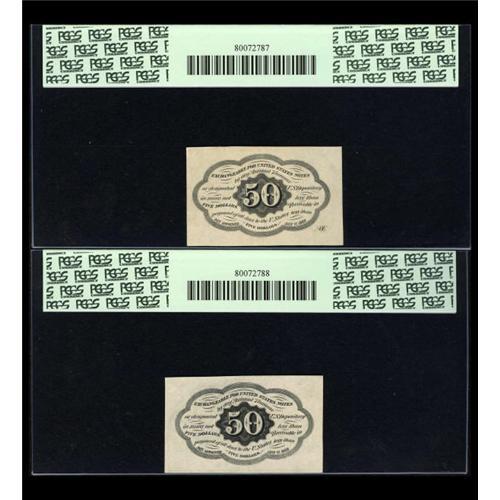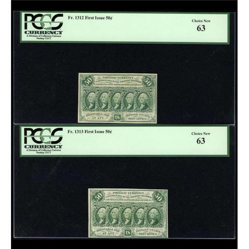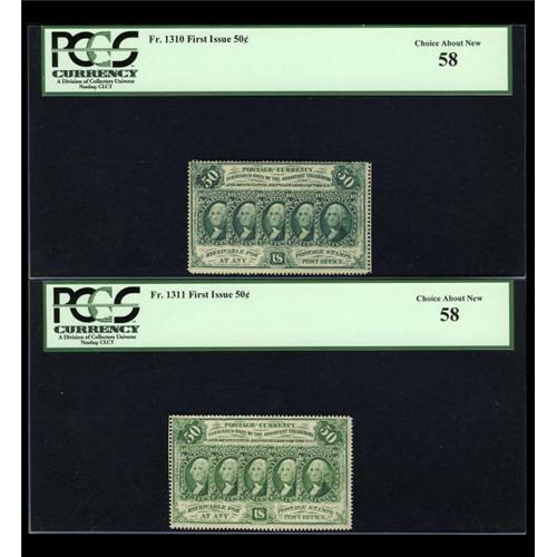 <B>Complete First Issue 50c Set.</B></I> <B>Fr. 1310</B></I> Perforated Edge with monogram<B> PCGS Choice About New 58</B></I>, <B>Fr. 1311 </B></I>Perforated Edge without monogram <B>PCGS Choice About New 58</B></I>,<B> Fr. 1312 </B></I>Straight Edge with monogram <B>PCGS Choice New 63</B></I>, and <B>Fr. 1313 </B></I>the very scarce Straight Edge no-monogram <B>PCGS Choice New 63</B></I>.<BR><I>From The Thomas M. Flynn Collection</B></I><BR><BR><b>Shipping:</b> Coins & Currency (<a target="_blank" href="http://www.heritageauctions.com/common/shipping.php">view shipping information</a>)