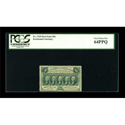 <B>Fr. 1310 50c First Issue PCGS Very Choice New 64PPQ.</B></I> The perforations remain undamaged and the margins are ample for the grade. We have seen many notes graded Gem with smaller margins.<BR><I>From The Kansas City Collection.</B></I><BR><BR><b>Shipping:</b> Coins & Currency (<a target="_blank" href="http://www.heritageauctions.com/common/shipping.php">view shipping information</a>)