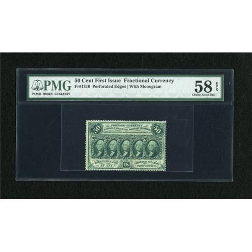 <B>Fr. 1310 50c First Issue PMG Choice About Unc 58 EPQ.</B></I> A bright and colorful example of this first issue perforated type that has three huge margins and a tight fourth.<BR><BR><b>Shipping:</b> Coins & Currency (<a target="_blank" href="http://www.heritageauctions.com/common/shipping.php">view shipping information</a>)