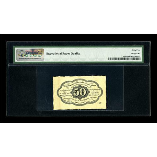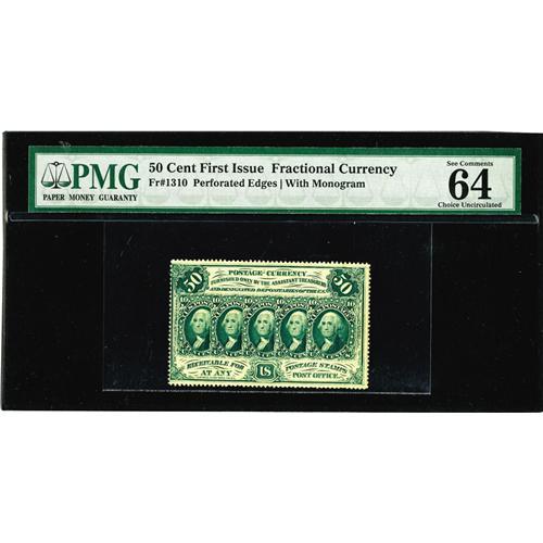 <B>Fr. 1310 50c First Issue PMG Choice Uncirculated 64 EPQ.</B></I> Three of the four margins on this perforated and monogrammed issue are larger than normal for the issue. A faint moisture mark is noted on the back and is mentioned for accuracy's sake.