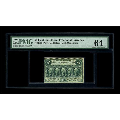<B>Fr. 1310 50c First Issue PMG Choice Uncirculated 64.</B></I> A superior example of this more challenging first issue perforated type that has huge margins, bright inks and exceptional paper.<BR><BR><b>Shipping:</b> Coin/Currency (<a target="_blank" href="http://www.heritageauctions.com/common/shipping.php">view shipping information</a>)